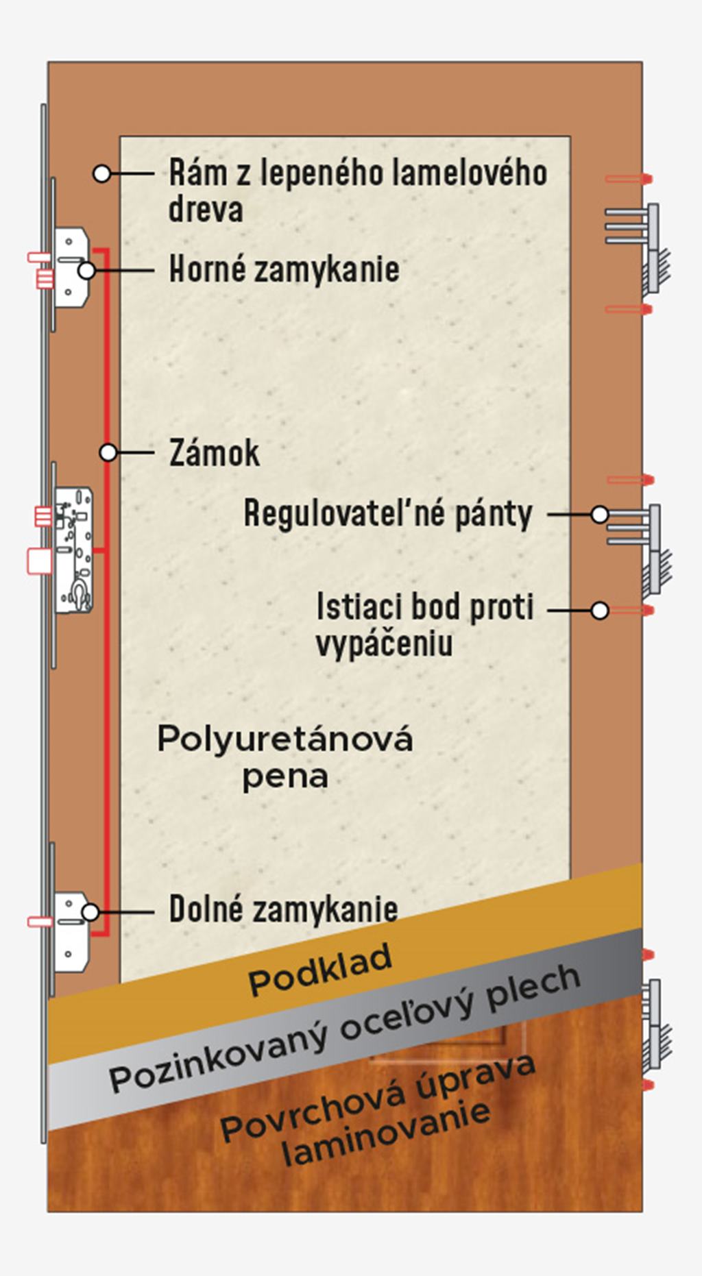Laminovaná zárubňa „9“ alebo „11“ s integrovaným tesnením Krídlo dverí s tesnením, vyplnené polyuretánovou penou a masívnym rámom z lepeného lamelového dreva